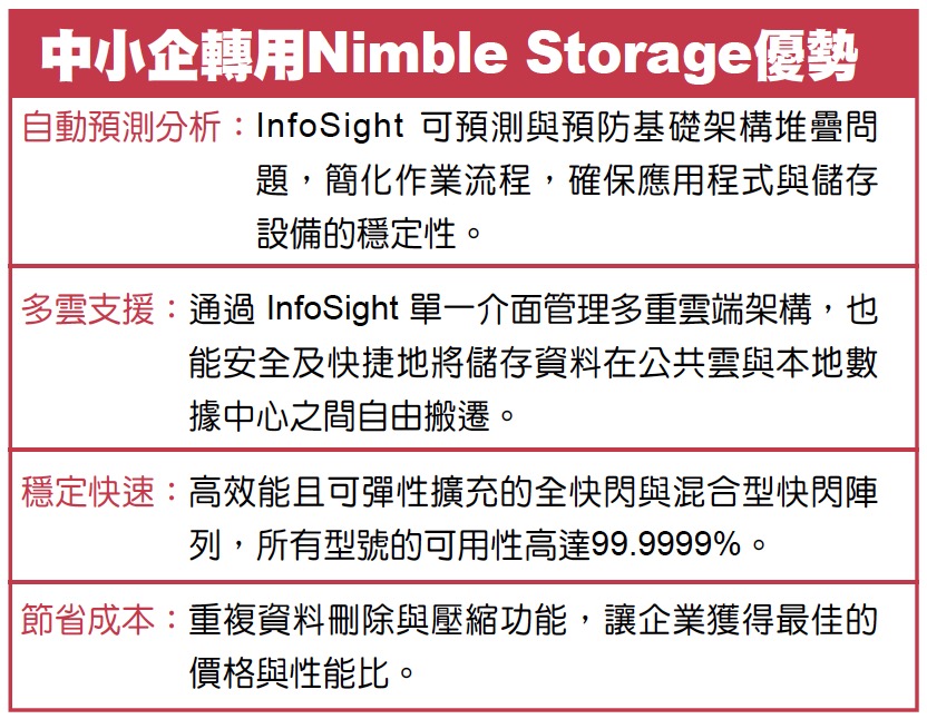 Toby Yeung 总结,Nimble Storage 实施简易,性价比高,特别适合中小企升级IT基建至云端及虚拟化应用。配合 InfoSight 即时分析用量、预测问题及自动修复功能,为中小企IT管理引入智能化,将日常IT管理工作化繁为简,强本节用。